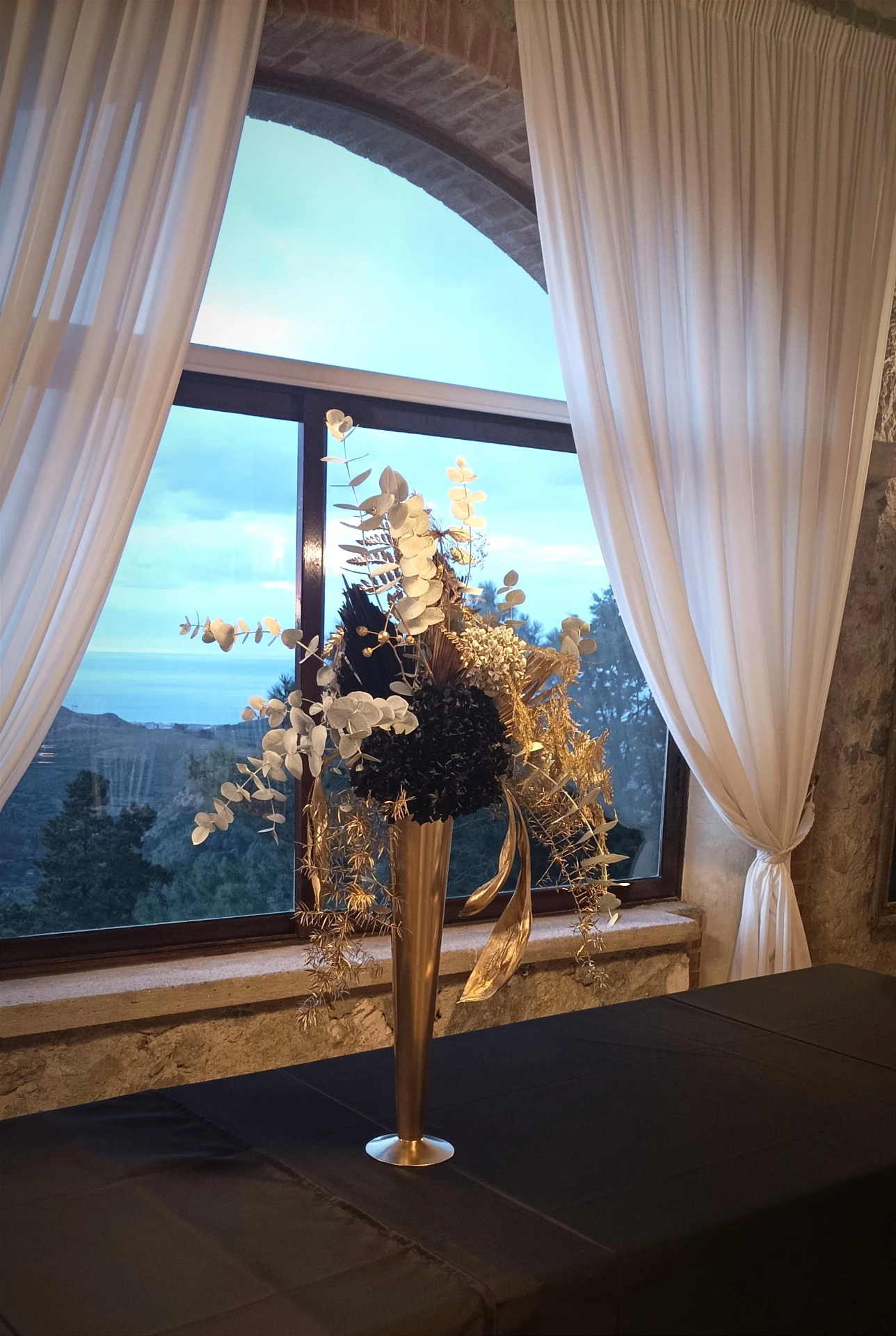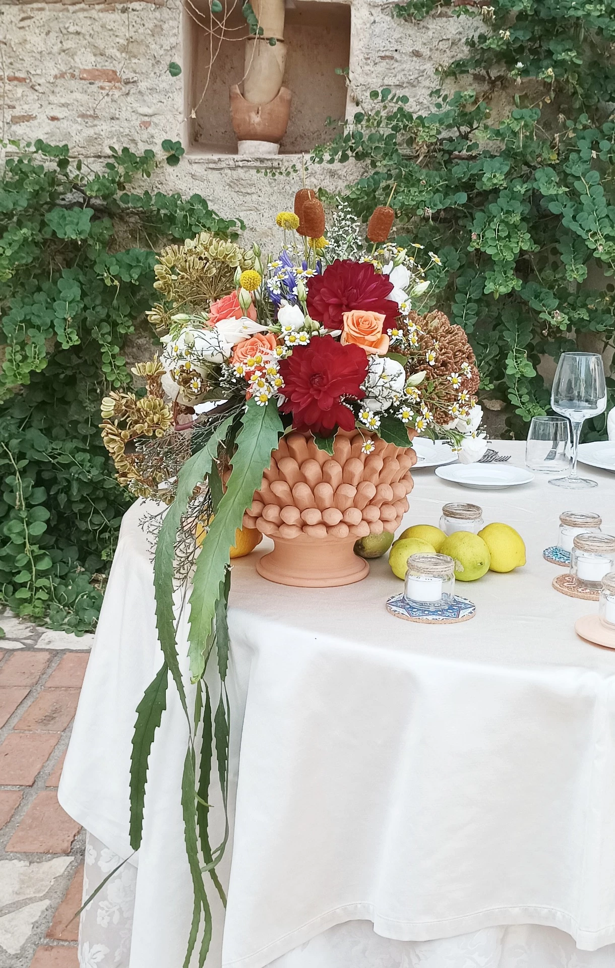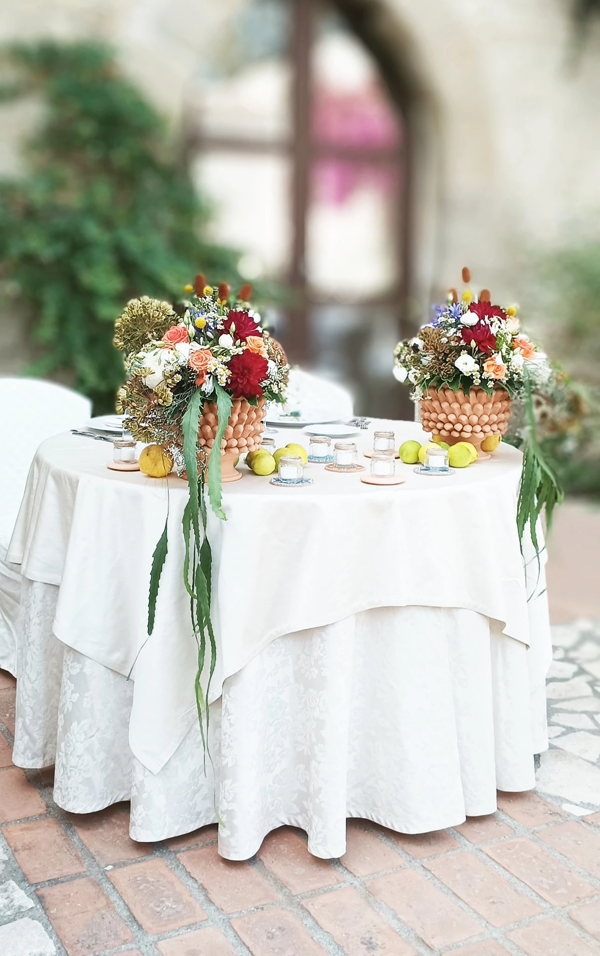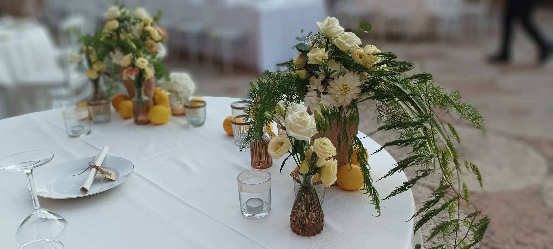 Porta candele, elementi naturali, ceramiche, vasi e oggetti decorativi vengono integrati con gusto negli allestimenti, per dare carattere e identità all’evento. Ogni dettaglio è studiato per dialogare con i fiori e con l’atmosfera generale, contribuendo a creare ambienti coerenti, autentici e ricchi di personalità.